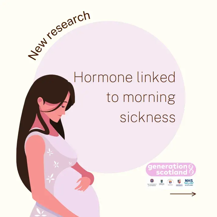 International study (Fejzo et al. 2024) helped by Generation Scotland volunteers, links hormone (GDF15) to developing pregnancy sickness. In an international study helped by Generation Scotland volunteers, a protein called GDF15 has been linked to developing pregnancy sickness. Analysis of GDF15 in GS volunteers helped show how it normally affects the general population. The BBC featured this research, Hyperemesis: Scientists make pregnancy sickness cure breakthrough Researchers have found that the hormone may cause nausea and vomiting in pregnancy, depending on how much of the hormone is made, and how sensitive the mother is to it. This international research could help prevent and treat pregnancy sickness, which affects as many as 70% of women during pregnancy. The Guardian featured this research, Morning sickness breakthrough raises hopes of possible cure Generation Scotland made an animated research summary of this featured on social media, shown below. This article was published on 2024-08-02