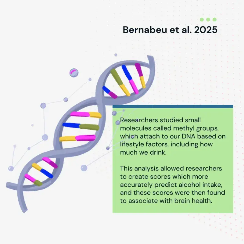 Data from Generation Scotland volunteers has allowed researchers to create a less biased way to measure alcohol consumption than self-reporting, and these measurements were then found to associate with brain health. Research Summary Drinking alcohol impacts brain health and increases disease risk. You might forget how much you drink, but your body remembers. Chemical changes to our DNA can reflect our drinking patterns and offer a less biased way to assess alcohol intake than self-report. This could improve future disease prediction and prevention.The researchers in this study looked at small molecules called methyl groups, which attach to our DNA based on lifestyle factors, including how much we drink.This analysis allowed researchers to create scores which more accurately predict alcohol intake, and these scores were then found to associate with brain health. More research is needed to know how these findings can be applied to understanding and treating disease. Read the Clinical Epigenetics Article (Bernabeu et al. 2025) Research Visual This article was published on 2025-02-05